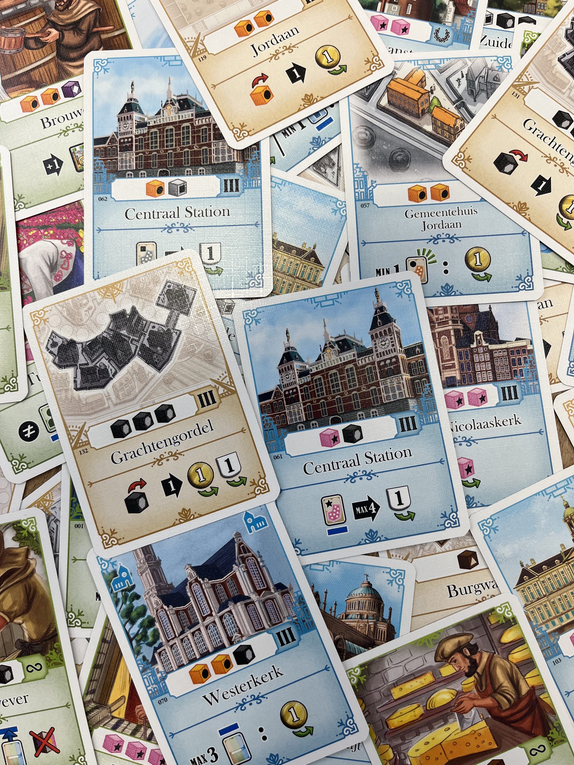 De spelers zijn invloedrijke Amsterdamse kooplieden, aan het einde van de 19e eeuw. Ze vervaardigen allerlei goederen, zoals meubels, tegels en kristal en slaan die op in de pakhuizen bij de haven, om ze vervolgens te verhandelen. Door handig de kaarten te gebruiken en slim dobbelstenen te kiezen, krijgen ze waardevolle grondstoffen. Hiermee kunnen ze huizenblokken in bezit nemen, belangrijke gebouwen bouwen, werklieden inhuren en hun schepen door de haven bewegen.Amsterdam wordt gespeeld over 12 rondes die elk uit 4 fases bestaan. In de eerste fase pak je een kaart uit het aanbod en leg je deze in je persoonlijke speelgebied. In de tweede fase worden alle dobbelstenen gegooid en kiezen spelers 2 dobbelstenen. Elke speler pakt het aantal grondstoffen van die dobbelsteen gelijk aan het resultaat. Het resultaat geeft aan hoeveel je er mag pakken, maar ook hoe lang het duurt voordat je de grondstoffen in een ronde kunt gebruiken (draaischijf). Daarna draai je de draaischijf, ontvang je alle grondstoffen van die ronde en mag je acties uitvoeren. Er zijn 8 verschillende acties die in een volgorde en combinatie naar keuze uitgevoerd kunnen worden. Probeer huizenblokken in de stad in bezit te nemen en de gewonnen grondstoffen met je vrachtship naar de verschillende havens te brengen. Door goederen af te leveren ontvang je punten. De huizenblokken leveren aan het einde van het spel punten op. De vooruitgang op de Amstel levert punten op maar draagt ook bij aan de speelvolgorde in de rondes. Door kaarten te activeren ontvang je in je beurt voordelen maar voorkom je ook strafpunten op het moment dat je te veel kaarten onder je spelersbord hebt liggen. Het doel is om zoveel mogelijk munten en punten te verzamelen. Na het uitvoeren van alle acties wordt de ronde afgesloten en na 12 rondes eindigt het spel. De speler met de meeste punten is de winnaar.