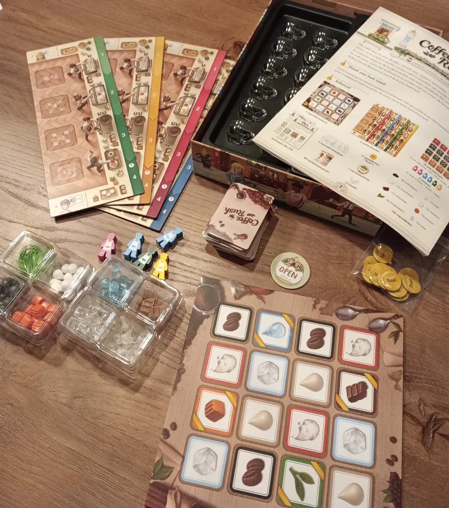 Coffee Rush ziet er fantastisch uit. De transparante kopjes en mini-ingrediënten zijn schattig en thematisch sterk. Alles heeft een eigen plek in de mooie component trays. De barista-meeples (met schort!) zijn een leuke toevoeging.
