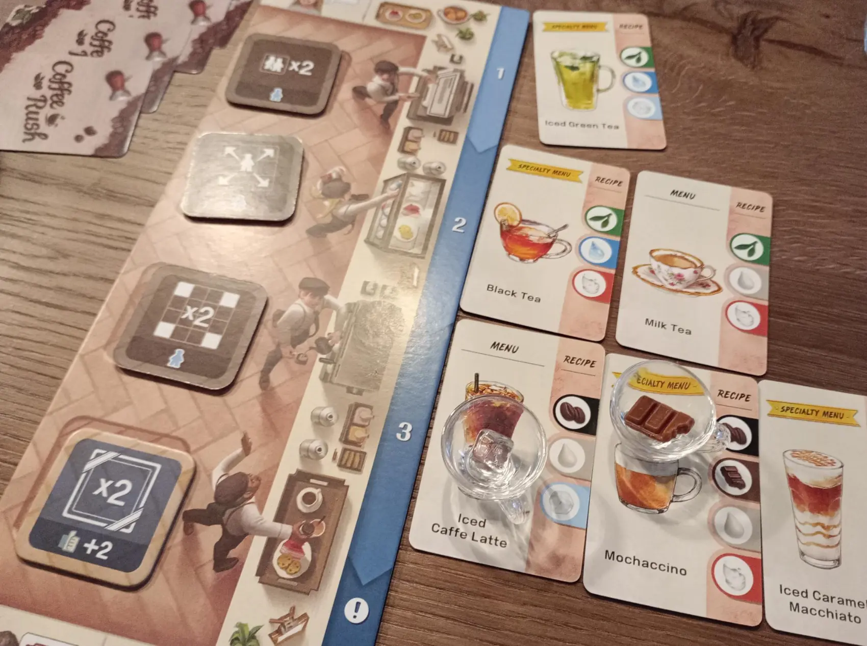 De setup van Coffee Rush is verrassend eenvoudig (en passend bij de titel): leg het Ingrediëntenbord klaar, vul de bakjes met ingrediënten, geef iedere speler drie kopjes, een spelersbord met gedekte upgradestegels, een meeple en een paar bestellingen. Binnen een paar minuten kun je van start.
