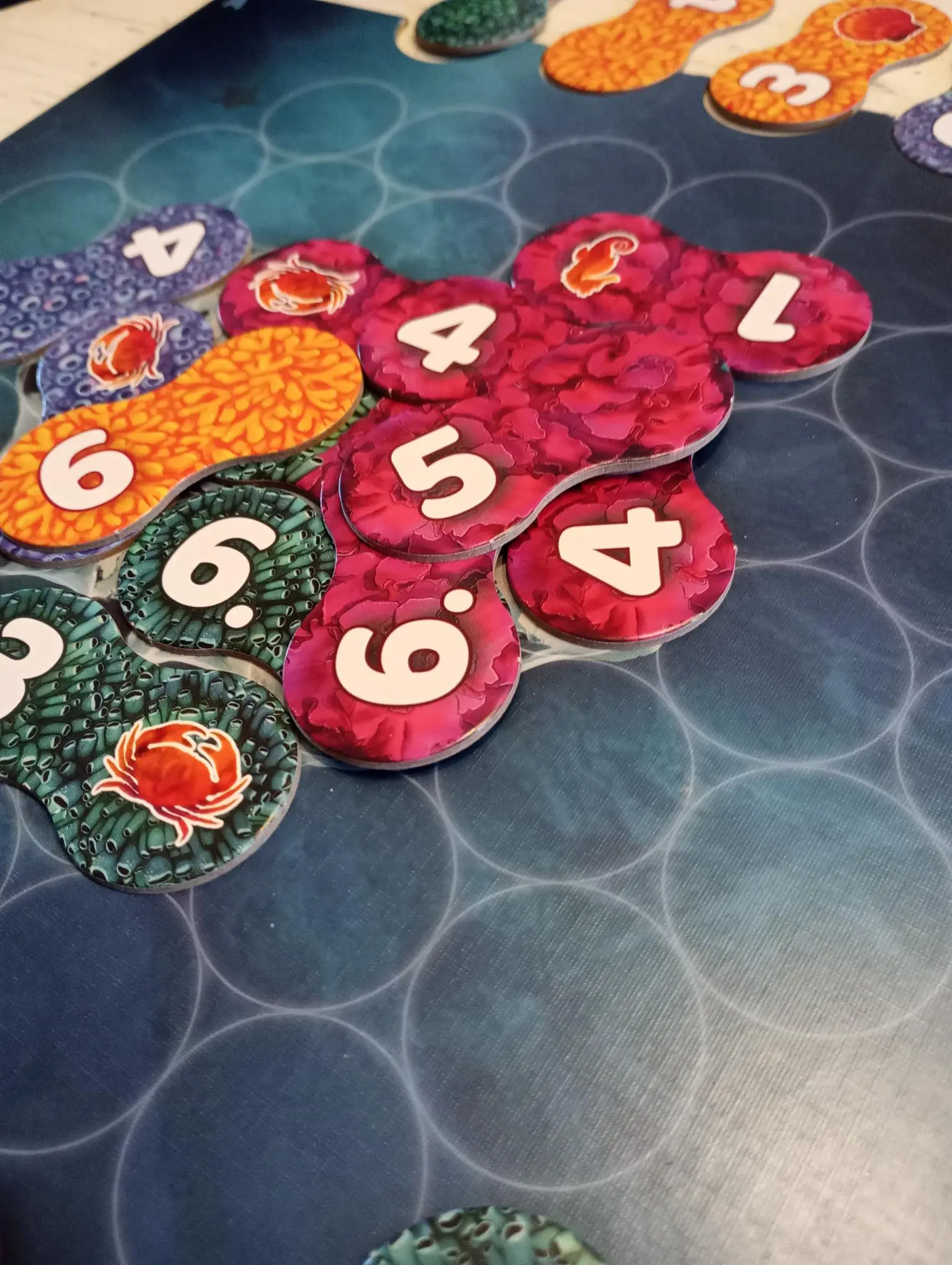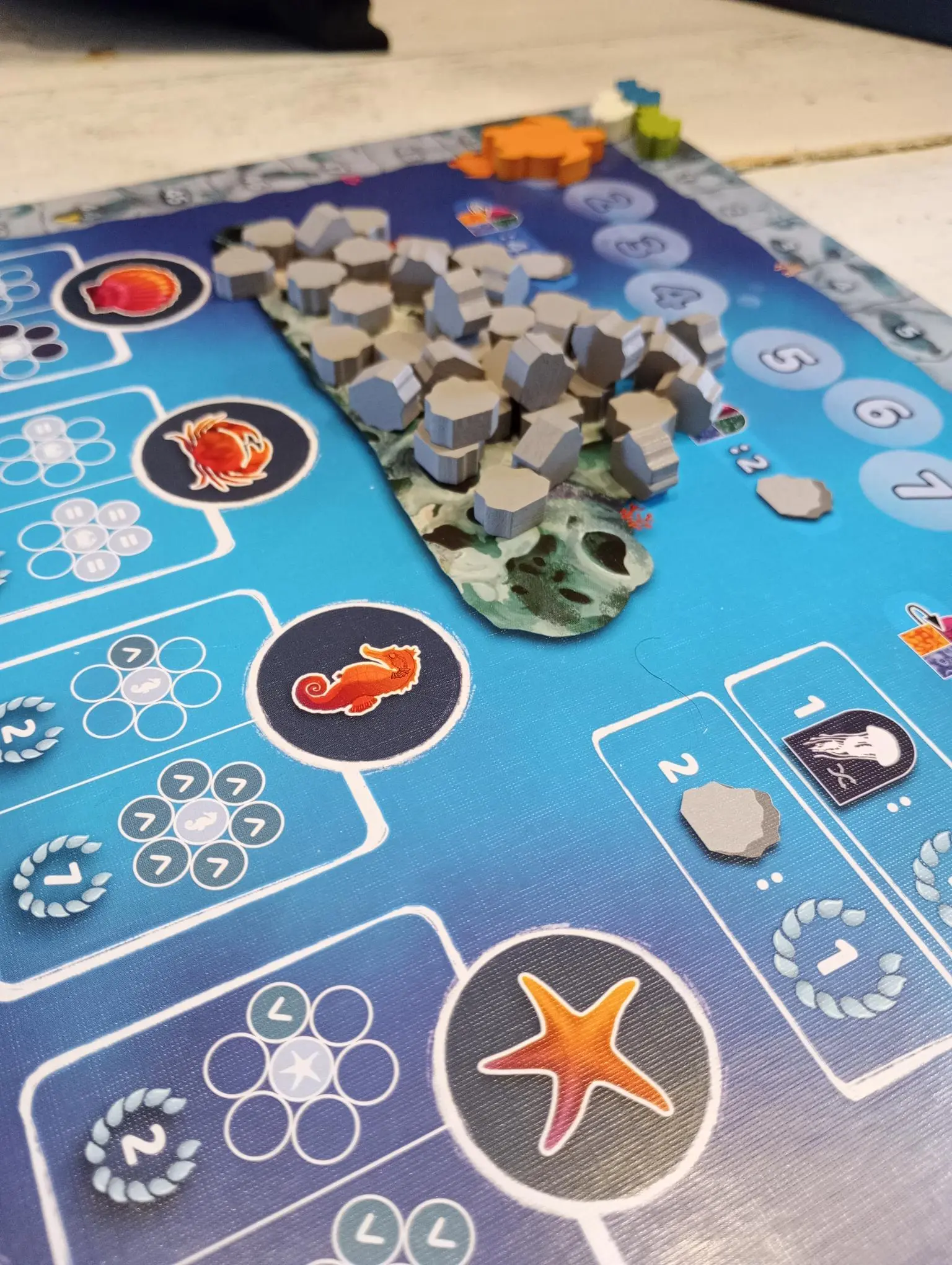 En dan kun je ook nog diertjes verzamelen – zeepaardjes, krabben, zeesterren – die allemaal op hun eigen manier scoren. Plus nog bonuspunten voor overgebleven kalksteen, sterretjes op tegels. De speler met het meeste koraal van een kleur ontvangt ook nog een leuke punten bonus. Kortom: genoeg manieren om jezelf rijk te rekenen.