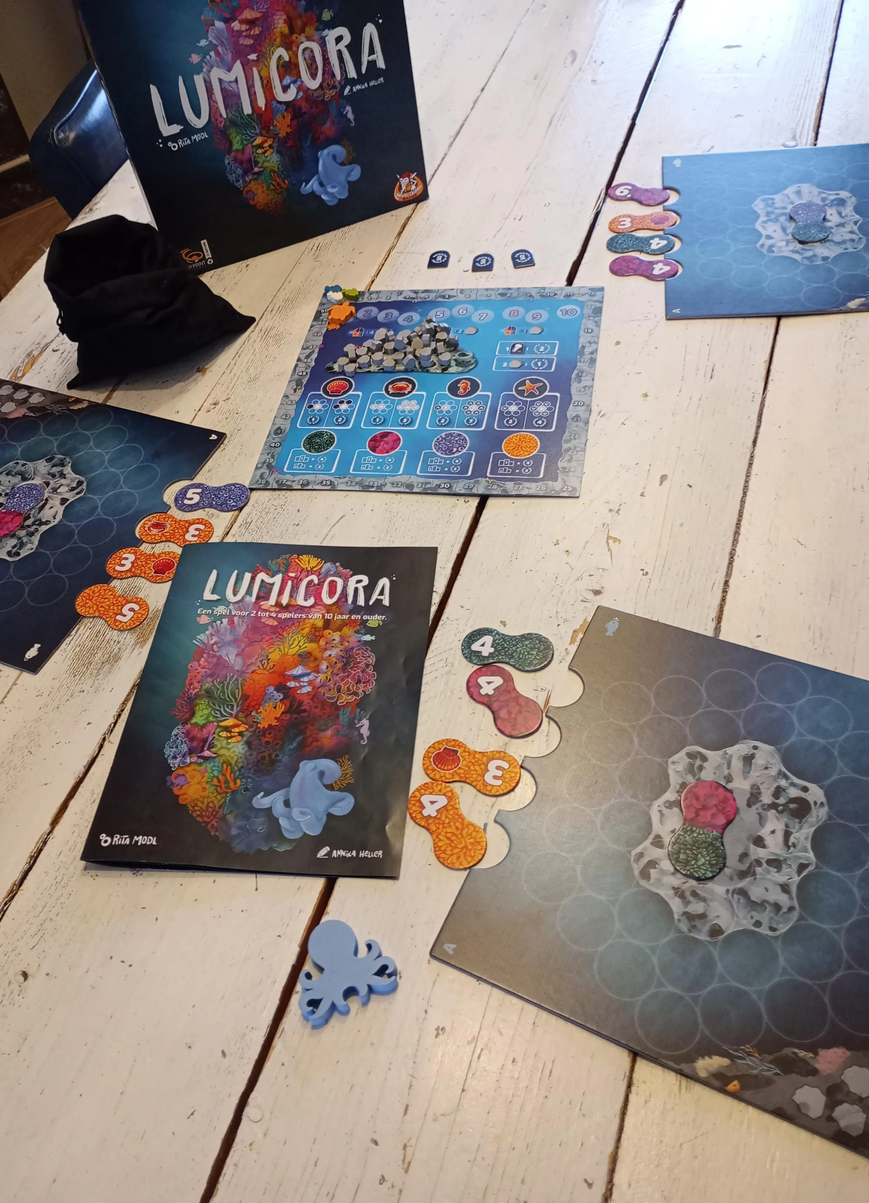 Lumicora speelt lekker vlot met 2 tot 4 spelers. Omdat je meestal gewoon je eigen ding doet, blijft het tempo er goed in. Een potje duurt zo’n 30 tot 45 minuten – tenzij iemand eeuwig zit te dubben (je weet wie je bent). En als je liever solo speelt: iemand heeft een creatieve variant bedacht waarbij een denkbeeldige tegenstander tegels van de atol pakt. Werkt verrassend goed, al moet je wel een beetje tegen jezelf kunnen verliezen.