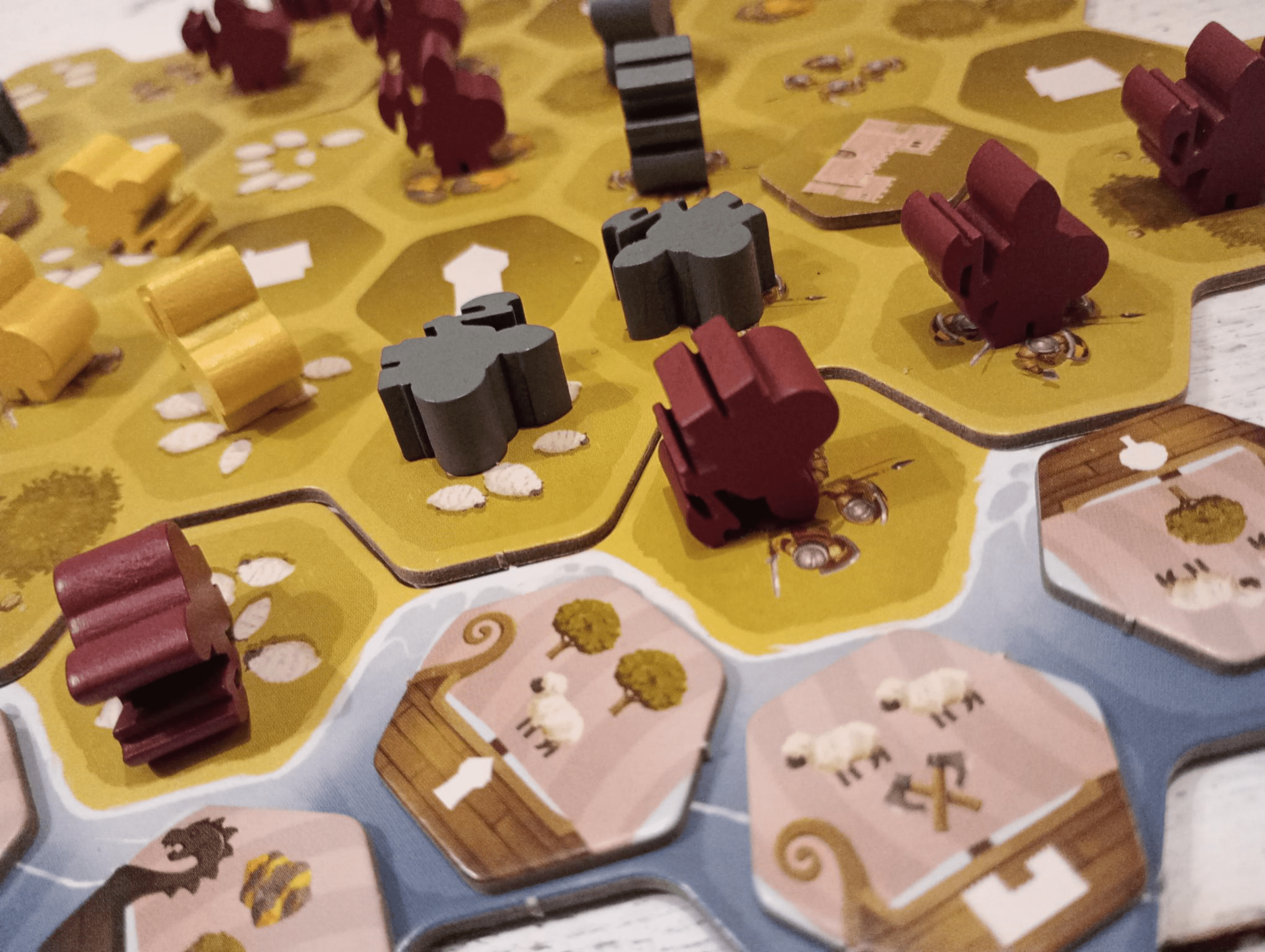 Viking plaatsen & grondstoffen verzamelen Het speelbord wordt opgebouwd uit willekeurig samengevoegde landschapstegels, waardoor elke sessie anders is. Spelers plaatsen om de beurt een Viking op het bord, altijd grenzend aan een bestaande vikingpion of schip. Afhankelijk van waar je je Viking neerzet, ontvang je een van de vier grondstoffen: hout, schapen, goud of bijlen. Daarnaast kun je strategisch gebouwen veroveren, zoals huizen (direct te claimen), wachttorens (verbindingen over meerdere velden nodig) en kastelen (minstens vier aangrenzende Vikingen vereist).