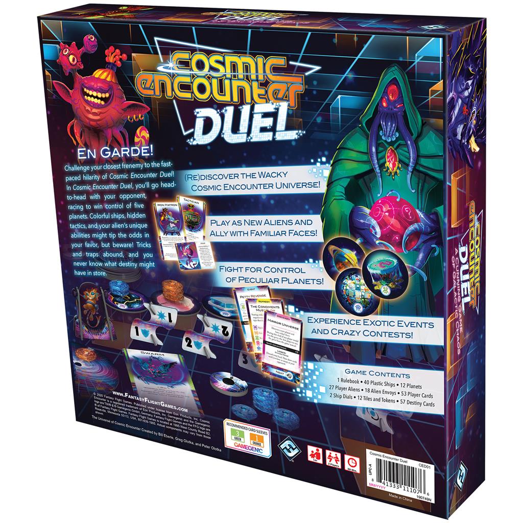 Cosmic Encounter Duel is a competitive standalone two-player game in the Cosmic Encounter universe in which you and your closest frenemy race to be the first to control five planets. Each of twenty-seven alien species comes equipped with its own unique abilities that play with the game mechanisms in some way, offering you an edge in the fight, e.g., the Cheater, who can reserve an additional tactic that they can put toward any fight in the game — as long as their opponent doesn't call out how they're trying to "cheat". How your game of Cosmic Encounter Duel plays out will inevitably be affected by which powers each dueling species has and how they play off of one another.