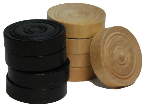 Damstenen kist hout. Luxe gedraaide damstenen, gefreest. Blank/zwart. Diameter: 33 mm. 2 x 20 stenen. In bruin gelakte houten klapkist van berkenhout.