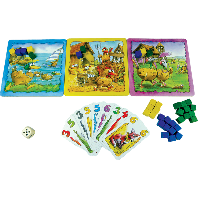 Vlot blufspel voor het hele gezin! Het pluimvee op de boerderij houdt een groot buffet. De vossen uit de omgeving eten ook graag mee, maar die hebben duidelijk een ander beeld van de samenstelling van het menu. Speel pluimveekaarten om graankorrels te verzamelen en vossenkaarten om juist pluimvee te verschalken. De locaties waar je de kaarten naartoe stuurt, bepalen wie er met de buit vandoor gaat. • Terug van weggeweest • Compact blufspel • Geschikt voor het hele gezin