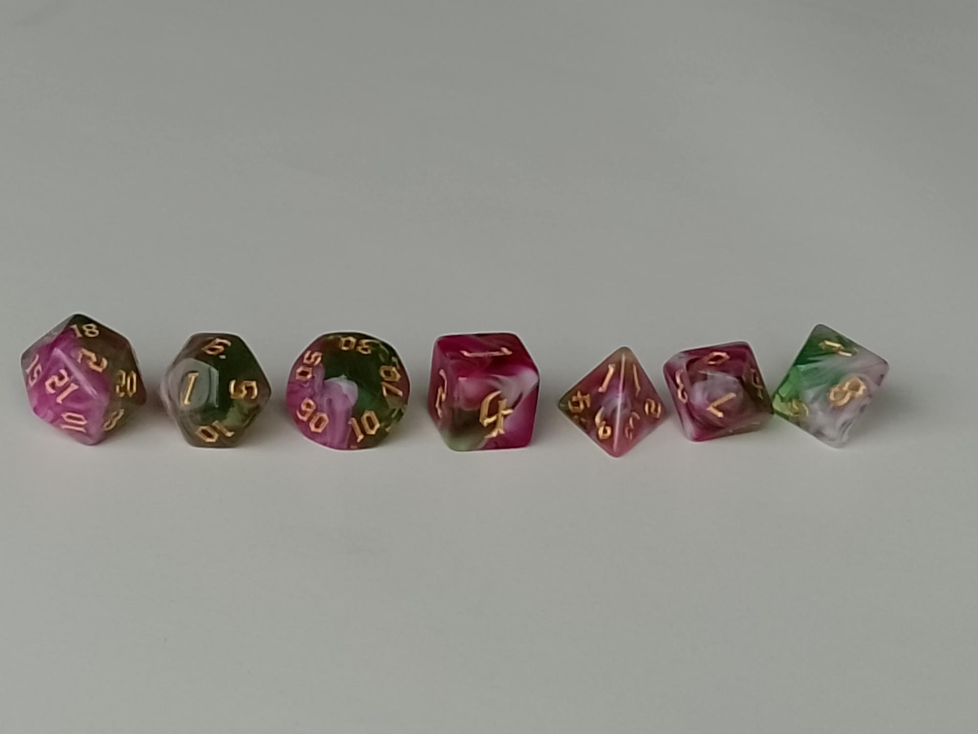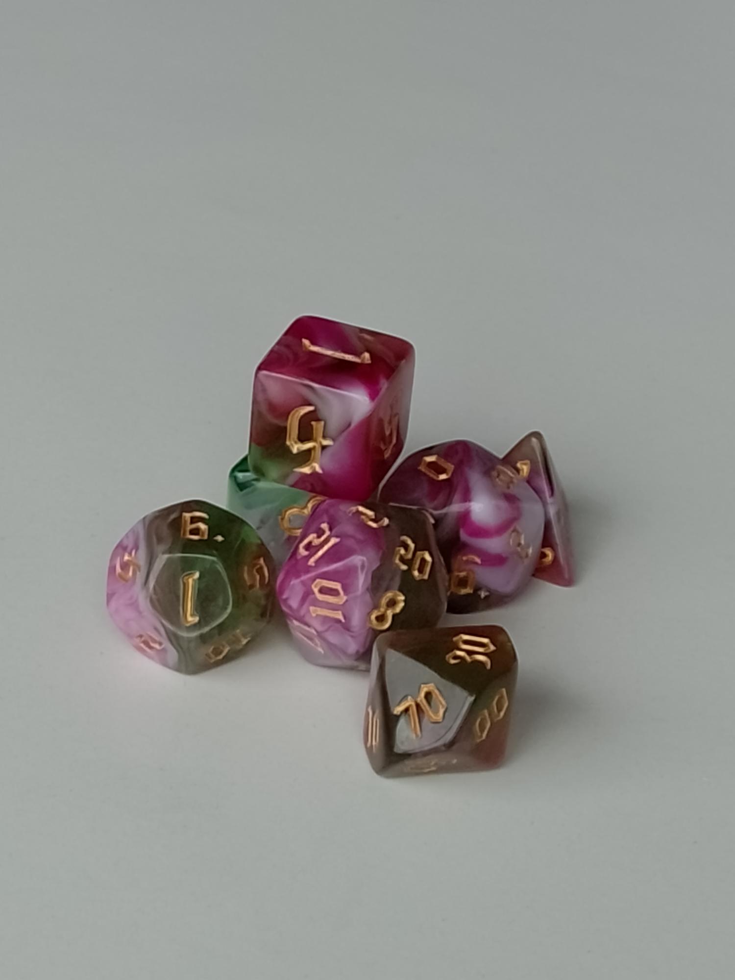 Deze opvallende set RPG-dobbelstenen, gemarmerd in een betoverende mix van roze, lime en goud, en verfraaid met even sprankelende gouden cijfers, voegt een vleugje speelsheid en elegantie toe aan je tafelrolspelsessies. Met dezelfde veelzijdigheid als iedere Dungeons and Dragons-set, bestaat deze collectie uit zeven dobbelstenen van verschillende aantallen zijden, inclusief een 20-zijdige dobbelsteen voor beslissende momenten en een tweede D10 voor het werpen van procenten.