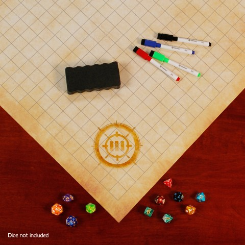 ENHANCE Tabletop RPG Grid Mat Campaign Kit - The perfect addition to any map-based RPG for reusable terrain drawing while adding a bit of thematic flair to your group's gaming session. Three carefully designed layers bring extreme durability that will outlast competing DnD battle maps. The top layer consists of a dry-erase surface that makes beginning a new storyline as easy as wiping with the included eraser (use and fill the spray bottle with clean water for more thorough ink removal). The high-resolution parchment print is reinforced by the playmat's backing layer to protect against peeling or lifting, which leads to ridging and impossible-to-erase stains in other erasable mats. A grid mat kit can't be equally complete for both Masters and newcomers without a protective Battle Scroll Case. Not only does it secure your map, but does so with a thematic appeal that we bet you'll appreciate.
