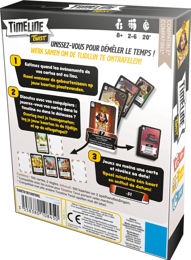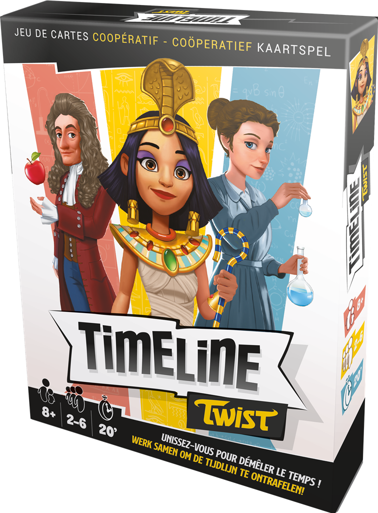 Timeline is vanaf nu ook een coöperatief spel! Trek bij elk spel 35 kaarten, denk na, overleg en bepaal de volgorde waarin je de kaarten zult leggen, waarbij je telkens de moeilijkste verwijdert. Probeer spel na spel een betere score te behalen.